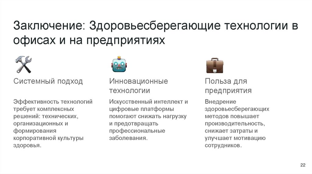 Заключение: Здоровьесберегающие технологии вофисах и на предприятиях