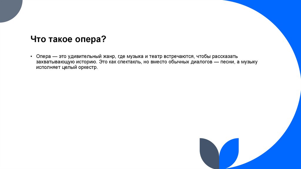 Что такое опера?• Опера — это удивительный жанр, где музыка и театр встречаются, чтобы рассказать