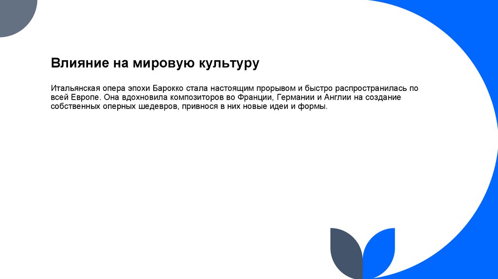 Влияние на мировую культуруИтальянская опера эпохи Барокко стала настоящим прорывом и быстро распространилась по