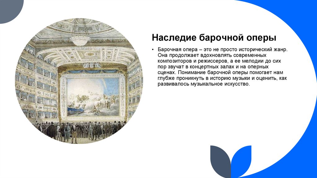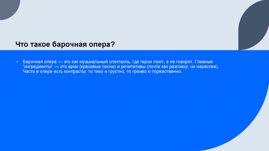 Что такое барочная опера?Барочная опера — это как музыкальный спектакль, где герои поют, а не говорят. Главные