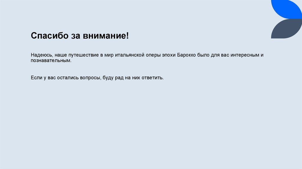 Спасибо за внимание!Надеюсь, наше путешествие в мир итальянской оперы эпохи Барокко было для вас интересным и