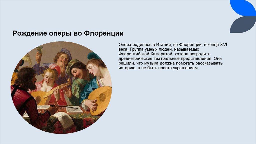 Рождение оперы во ФлоренцииОпера родилась в Италии, во Флоренции, в конце XVI