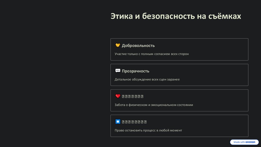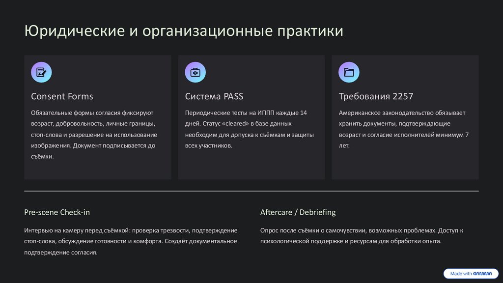 стоп-слова, обсуждение готовности и комфорта. Создаёт документальное