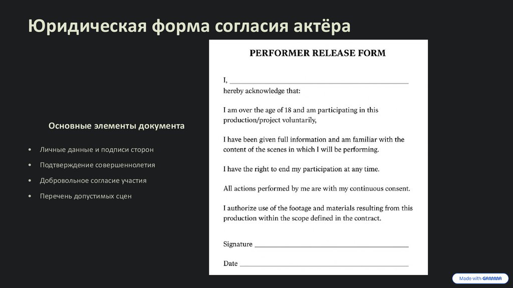 Юридическая форма согласия актёраОсновные элементы документа