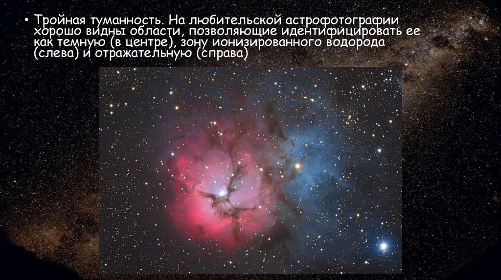 • Тройная туманность. На любительской астрофотографиихорошо видны области, позволяющие идентифицировать ее