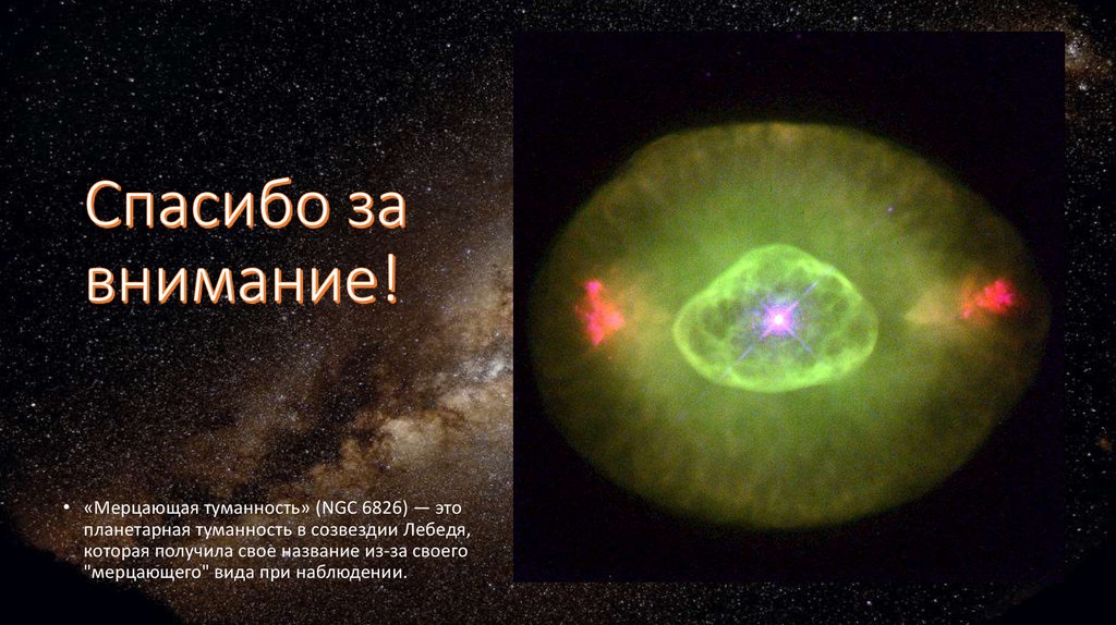 • «Мерцающая туманность» (NGC 6826) — этопланетарная туманность в созвездии Лебедя,