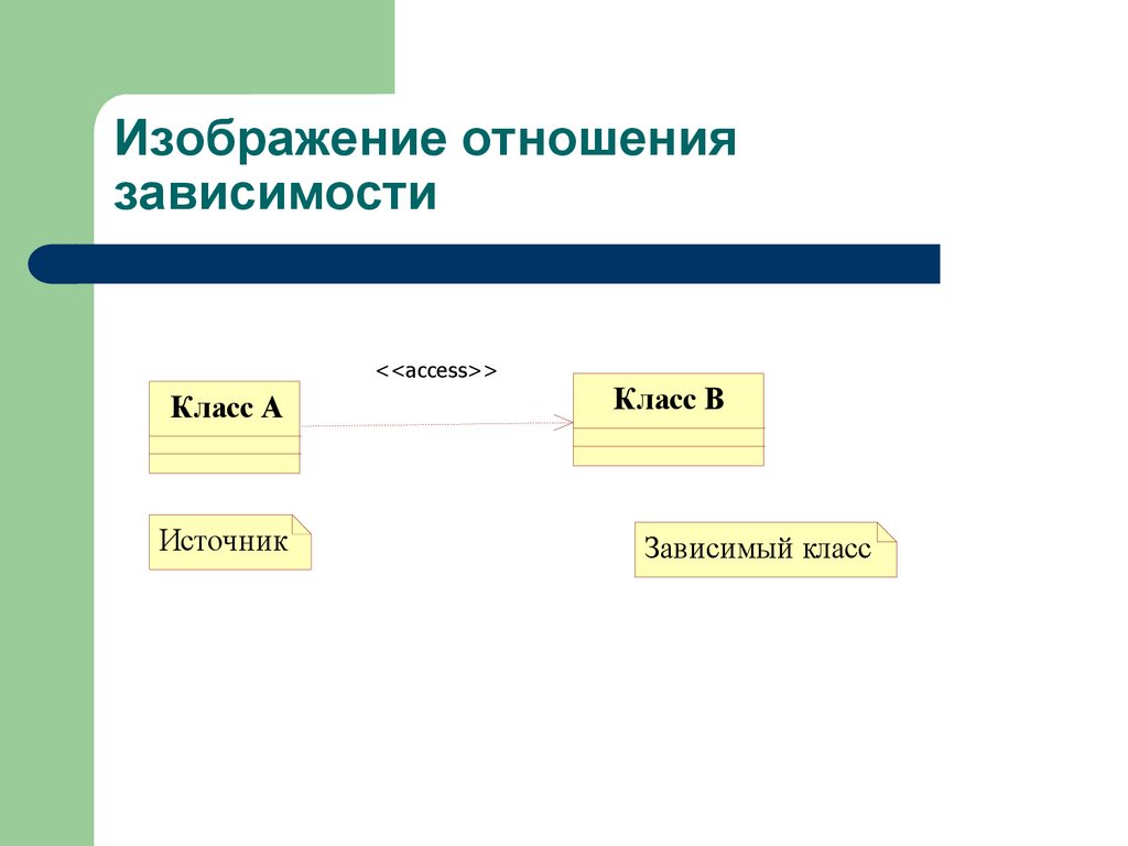 Стандартные зависимости"import" - открытые атрибуты и операции классаисточника становятся частью класса-клиента, как