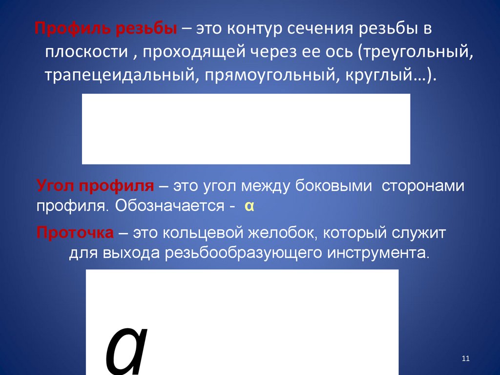 Профиль резьбы – это контур сечения резьбы вплоскости , проходящей через ее ось (треугольный,
