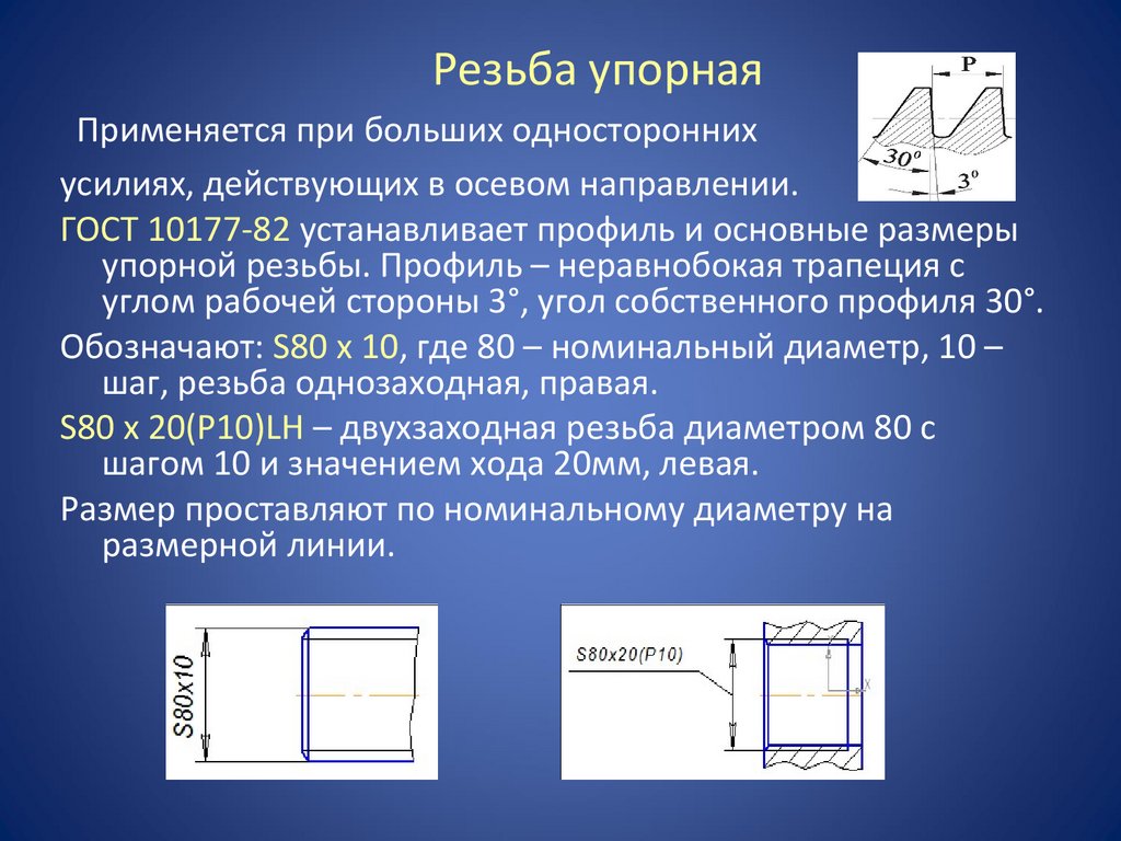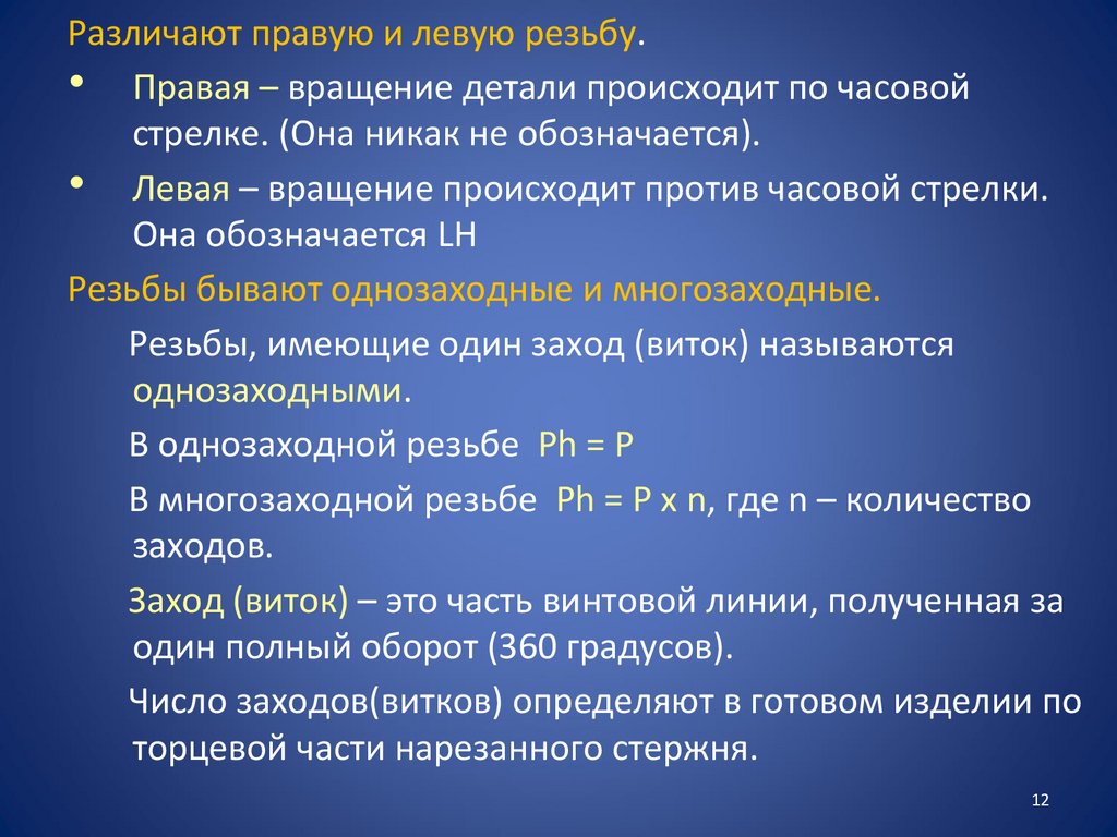 Различают правую и левую резьбу.• Правая – вращение детали происходит по часовой