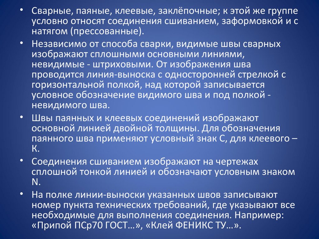 • Сварные, паяные, клеевые, заклёпочные; к этой же группеусловно относят соединения сшиванием, заформовкой и с
