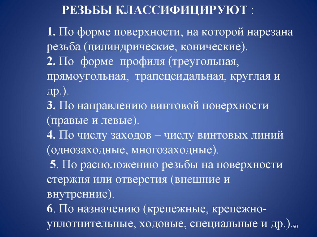 6. По назначению (крепежные, крепежноуплотнительные, ходовые, специальные и др.).50