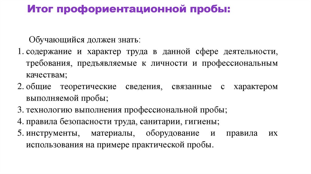 Цель – осознанное представление результатадеятельности по профессиональной пробе,