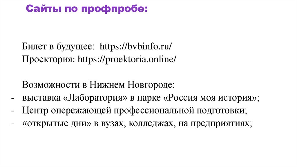 Сайты по профпробе:Билет в будущее: https://bvbinfo.ru/https://bvbinfo.ru/