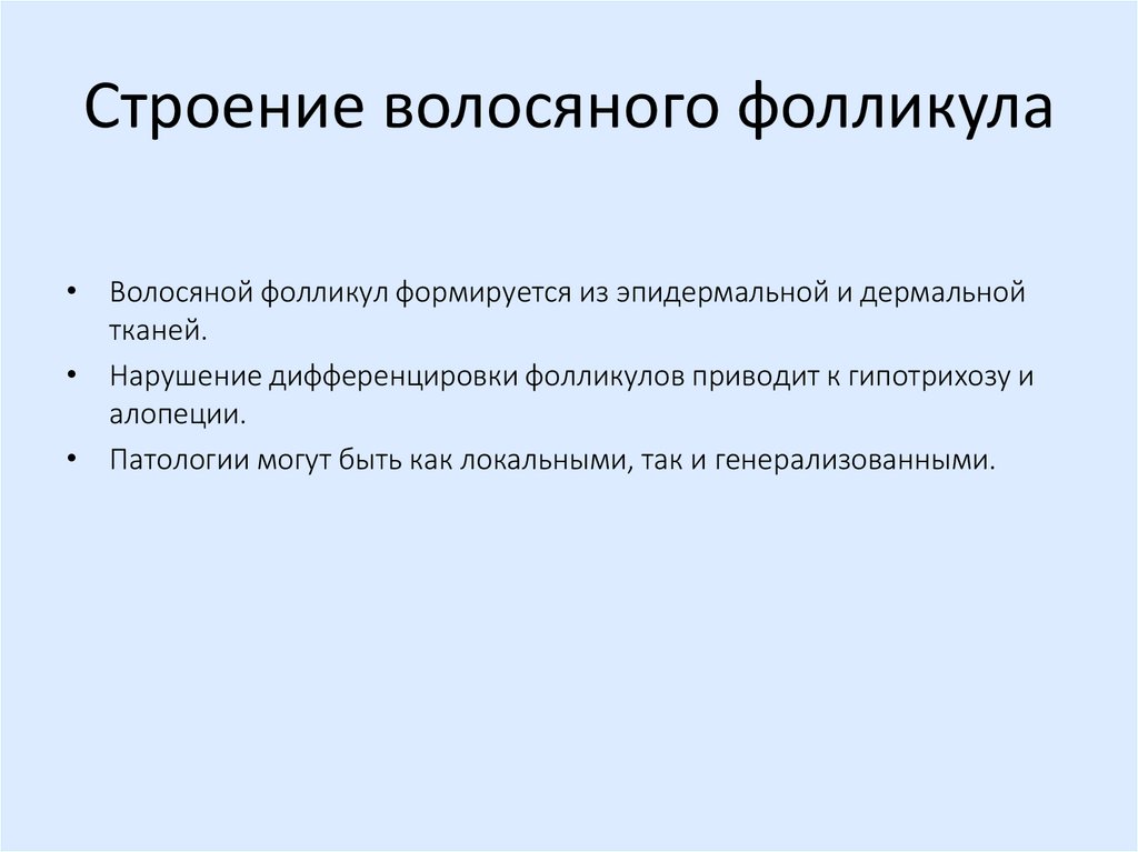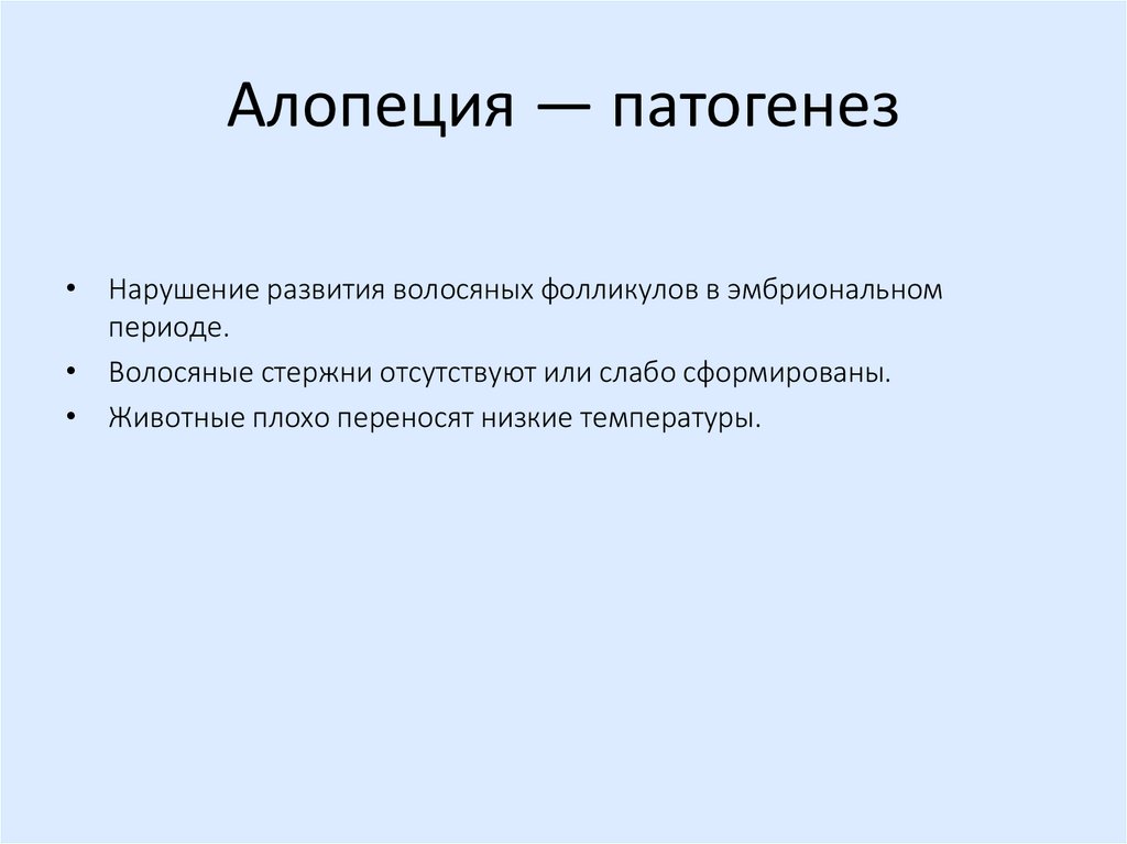Алопеция — патогенез• Нарушение развития волосяных фолликулов в эмбриональном
