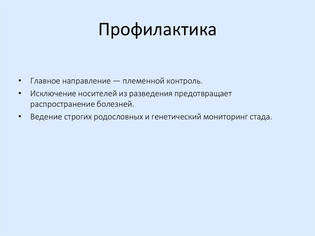 Профилактика• Главное направление — племенной контроль.