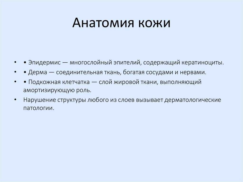 • Нарушение структуры любого из слоев вызывает дерматологические