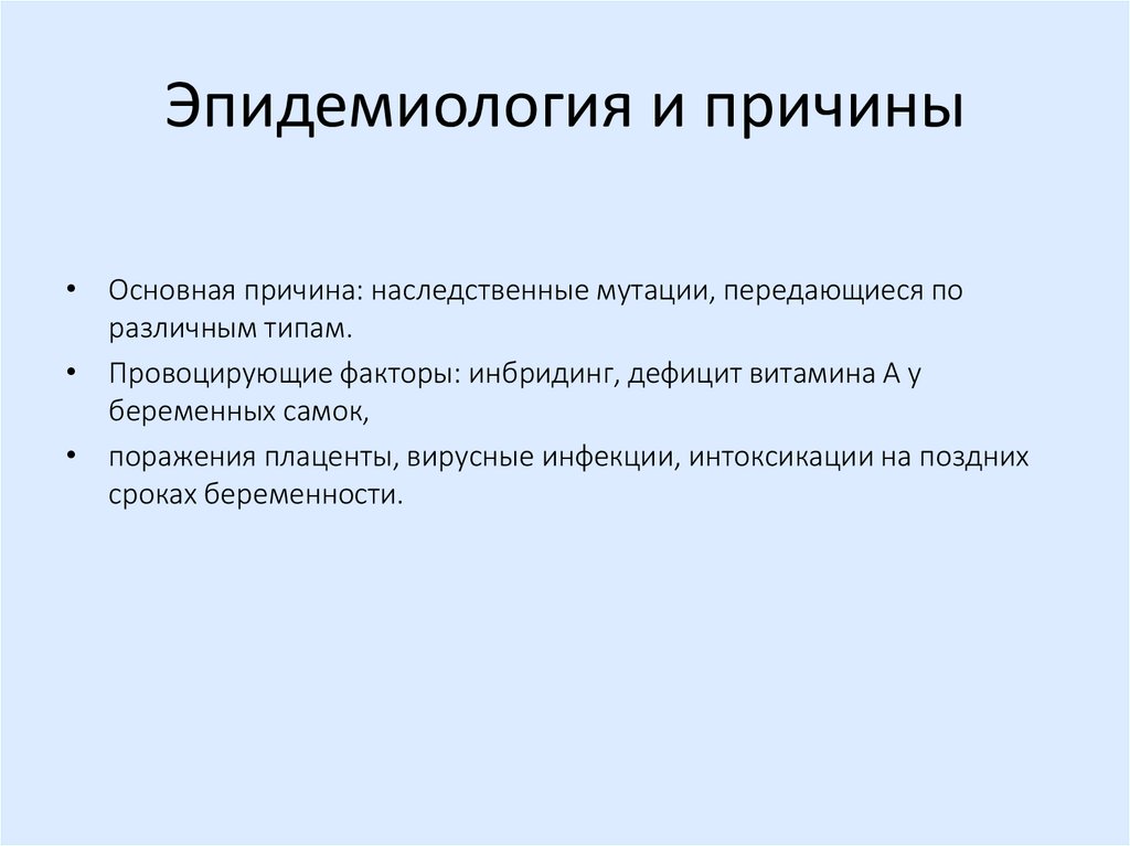 • Провоцирующие факторы: инбридинг, дефицит витамина A у