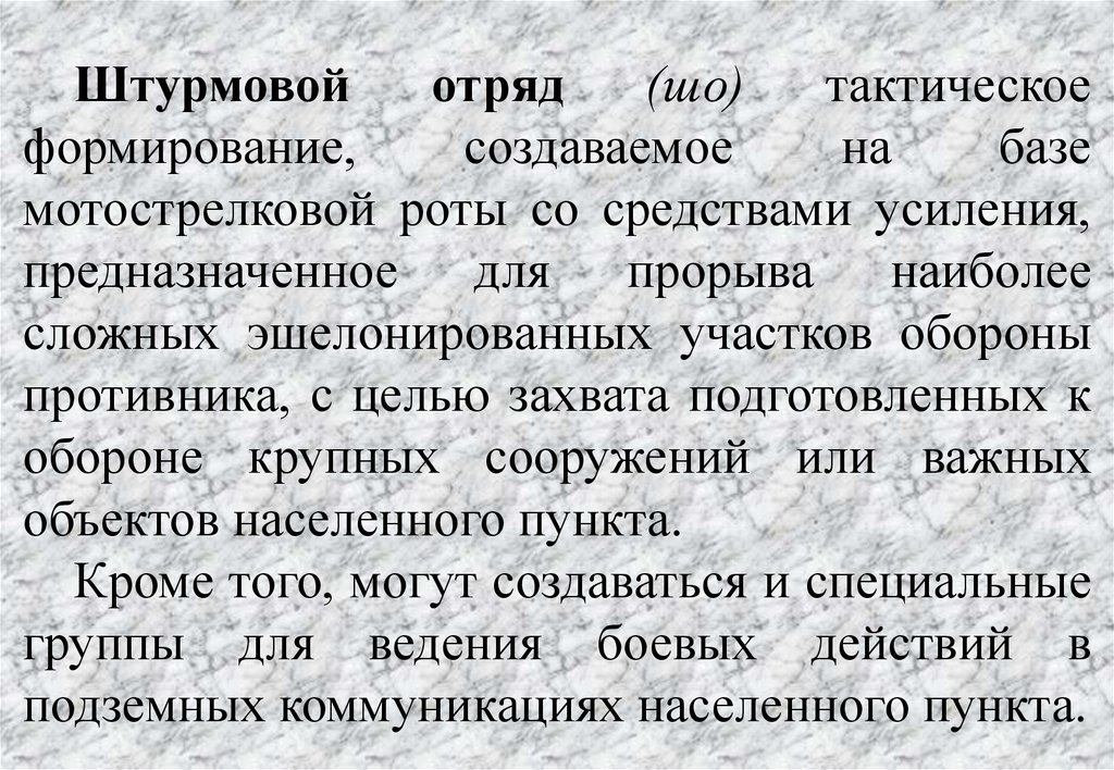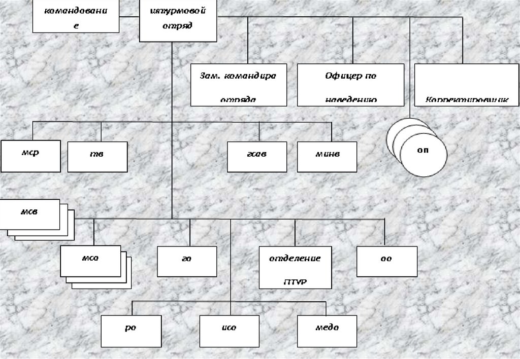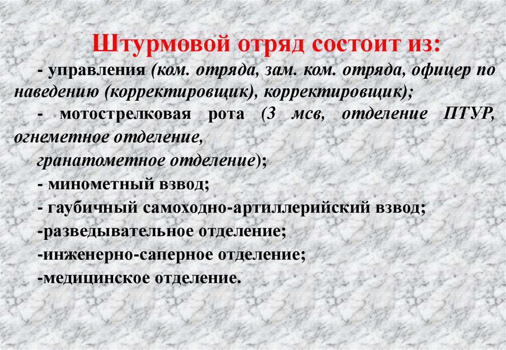Штурмовой отряд состоит из:- управления (ком. отряда, зам. ком. отряда, офицер по