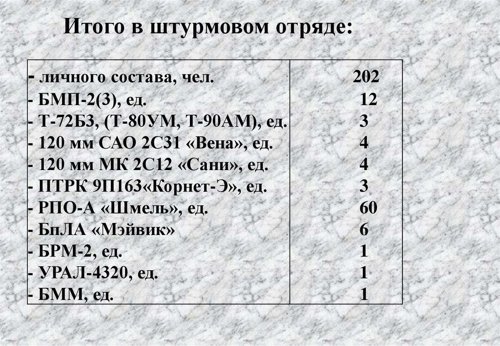 Итого в штурмовом отряде:- личного состава, чел.