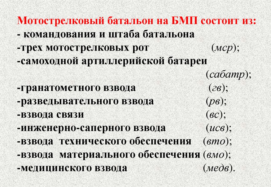Мотострелковый батальон на БМП состоит из:- командования и штаба батальона