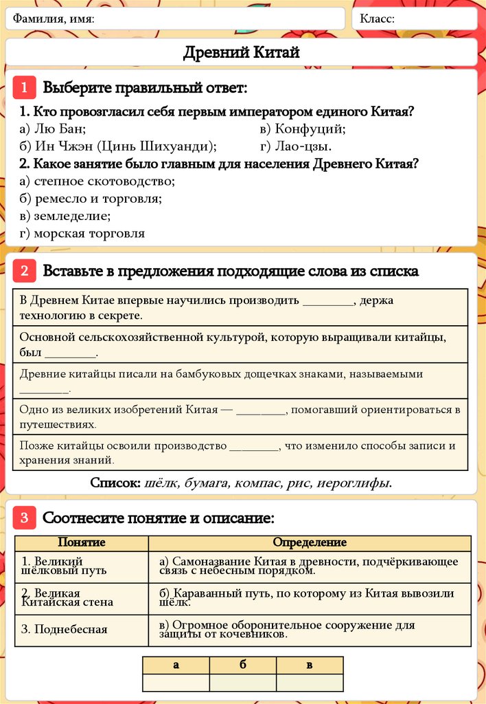 Список: шёлк, бумага, компас, рис, иероглифы.