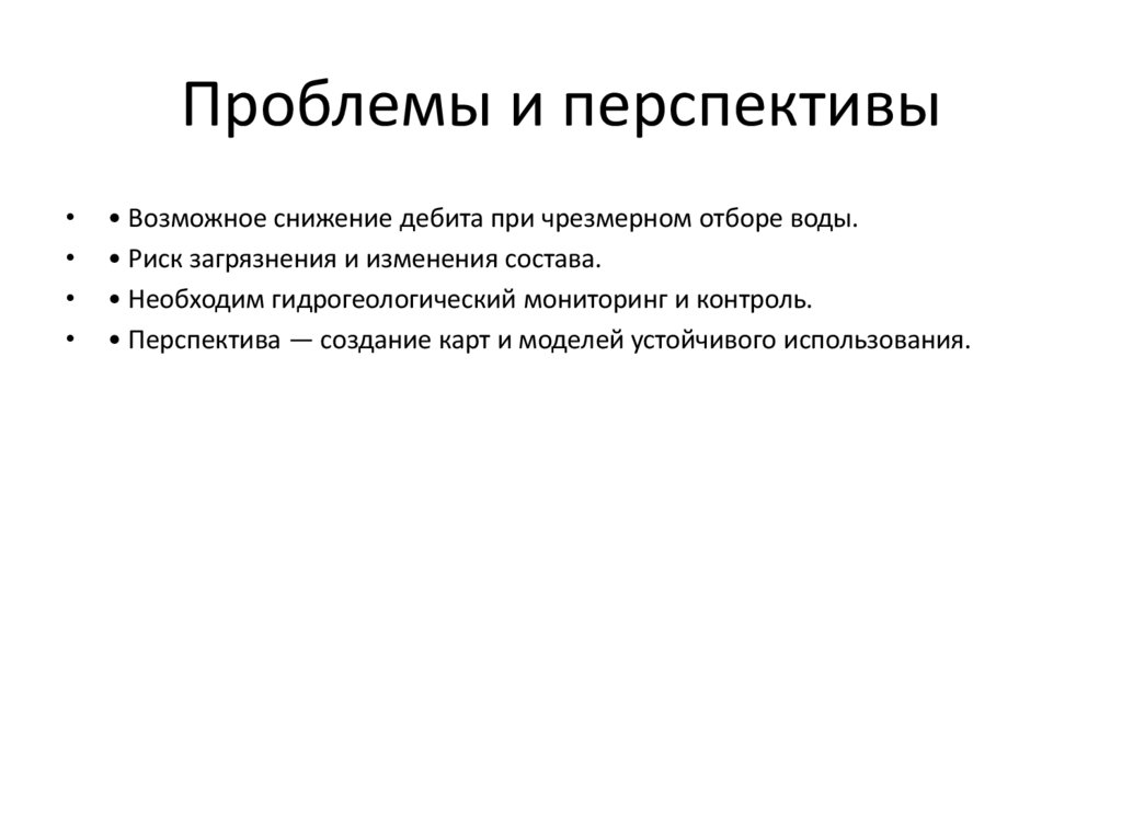 Проблемы и перспективы• Возможное снижение дебита при чрезмерном отборе воды.