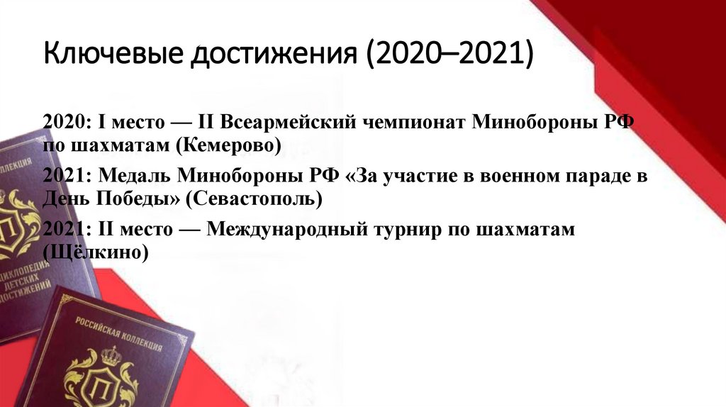Ключевые достижения (2020–2021)2020: I место — II Всеармейский чемпионат Минобороны РФ
