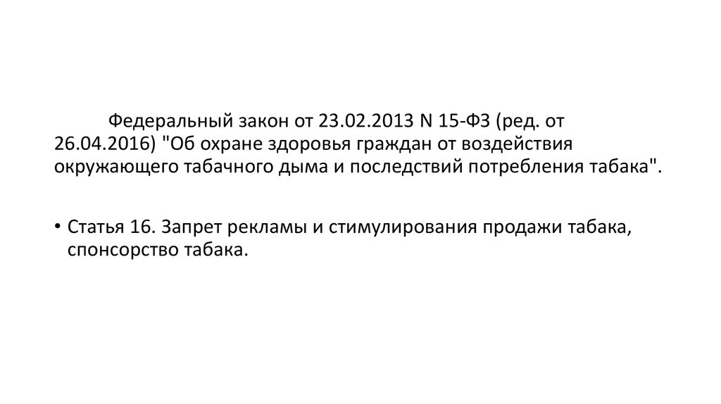 Федеральный закон от 23.02.2013 N 15-ФЗ (ред. от26.04.2016) "Об охране здоровья граждан от воздействия