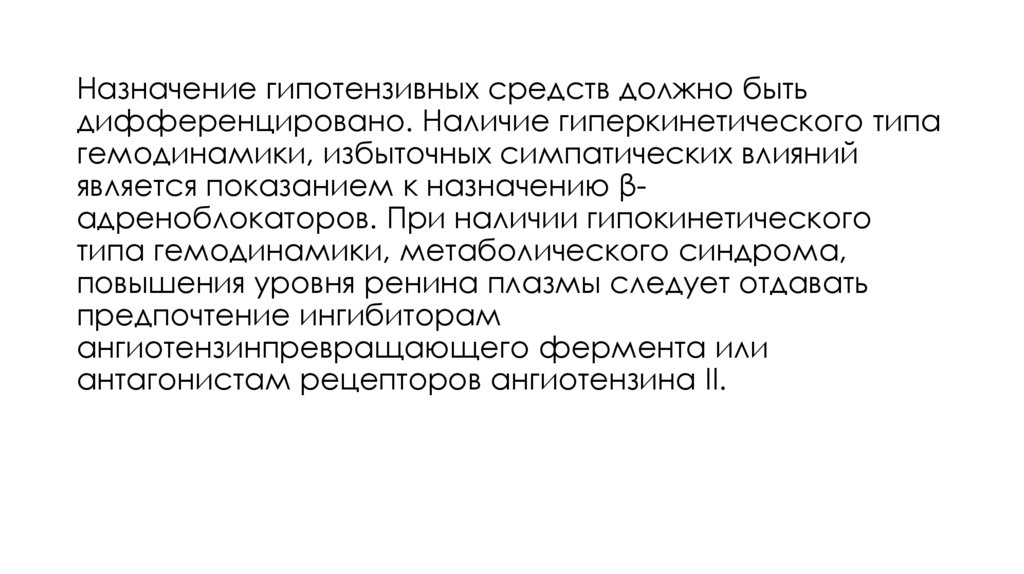 Назначение гипотензивных средств должно бытьдифференцировано. Наличие гиперкинетического типа