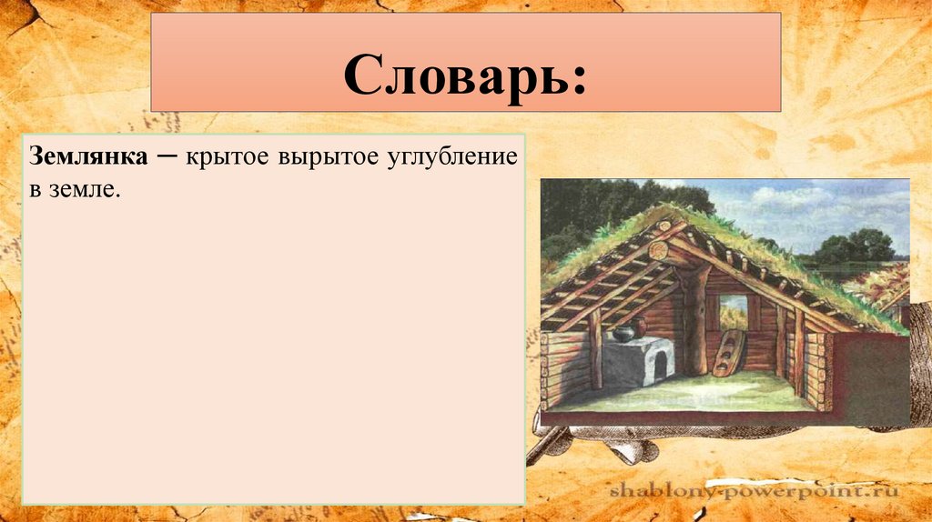 Словарь:Землянка ─ крытое вырытое углубление