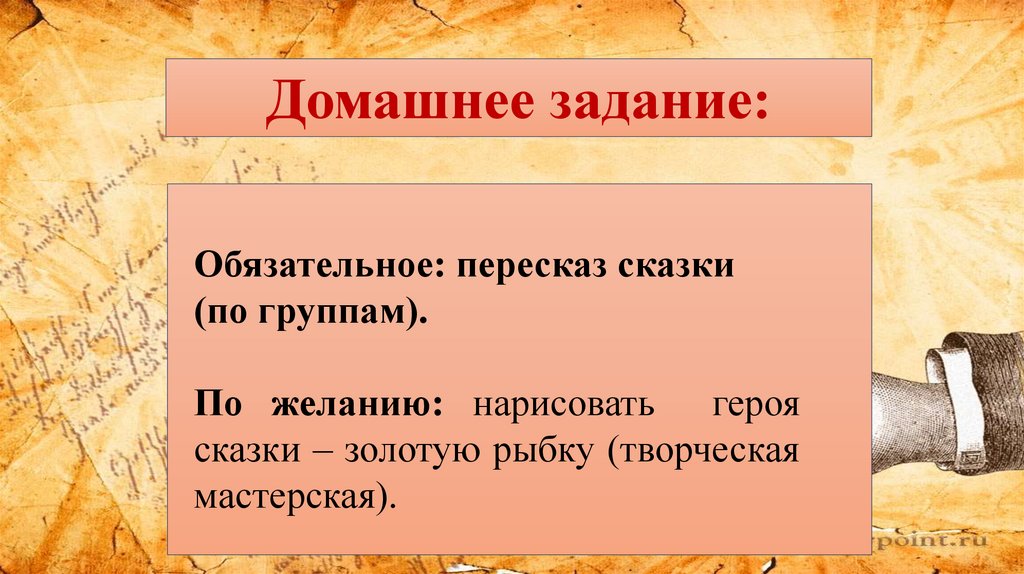 Домашнее задание:Обязательное: пересказ сказки