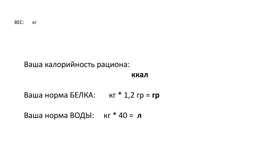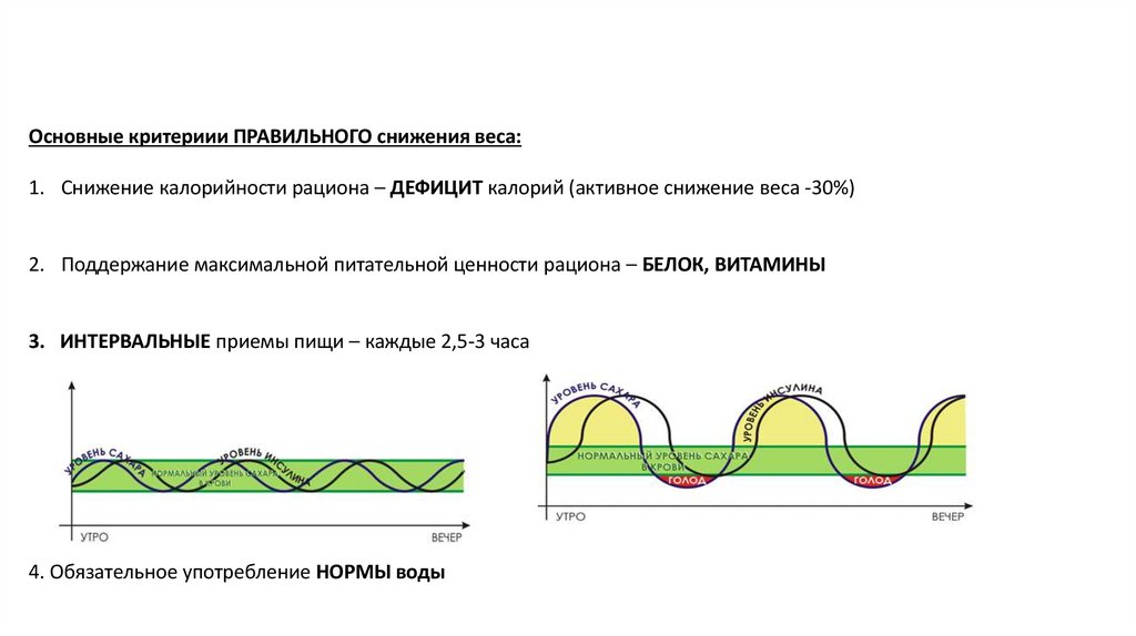 Основные критериии ПРАВИЛЬНОГО снижения веса:1. Снижение калорийности рациона – ДЕФИЦИТ калорий (активное снижение веса -30%)