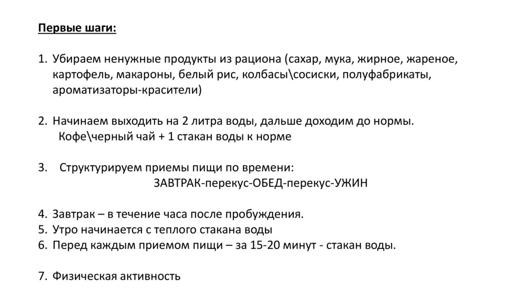 Первые шаги:1. Убираем ненужные продукты из рациона (сахар, мука, жирное, жареное,