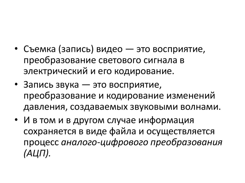• Съемка (запись) видео — это восприятие,преобразование светового сигнала в