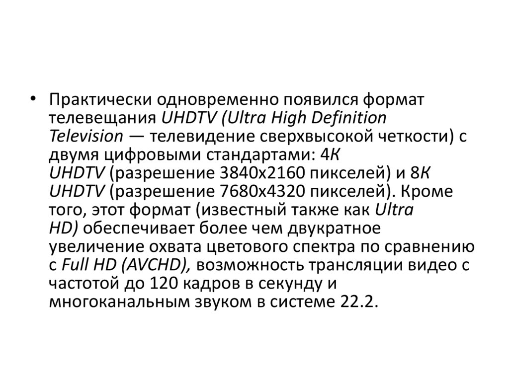 • Практически одновременно появился форматтелевещания UHDTV (Ultra High Definition