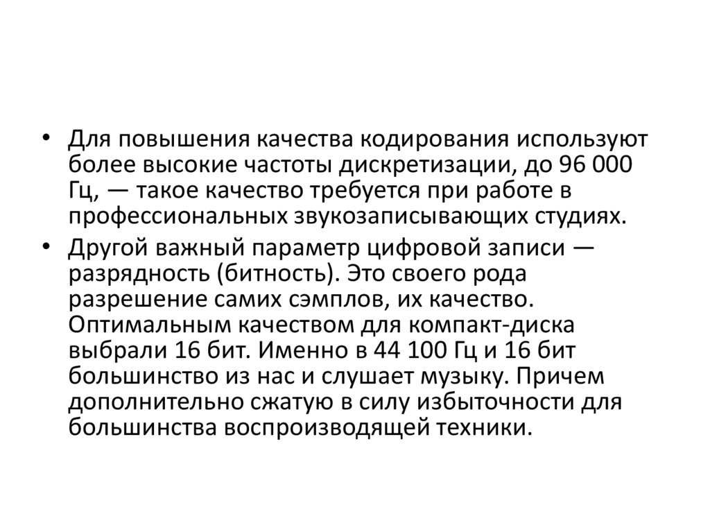 • Для повышения качества кодирования используютболее высокие частоты дискретизации, до 96 000