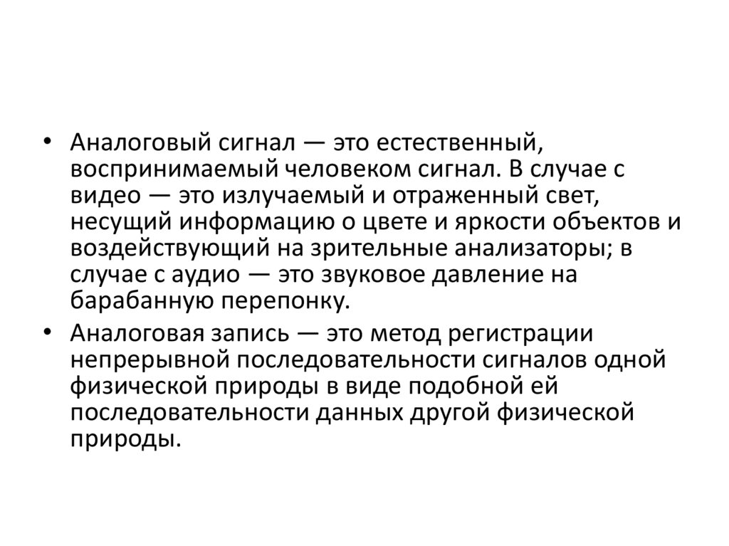 • Аналоговый сигнал — это естественный,воспринимаемый человеком сигнал. В случае с