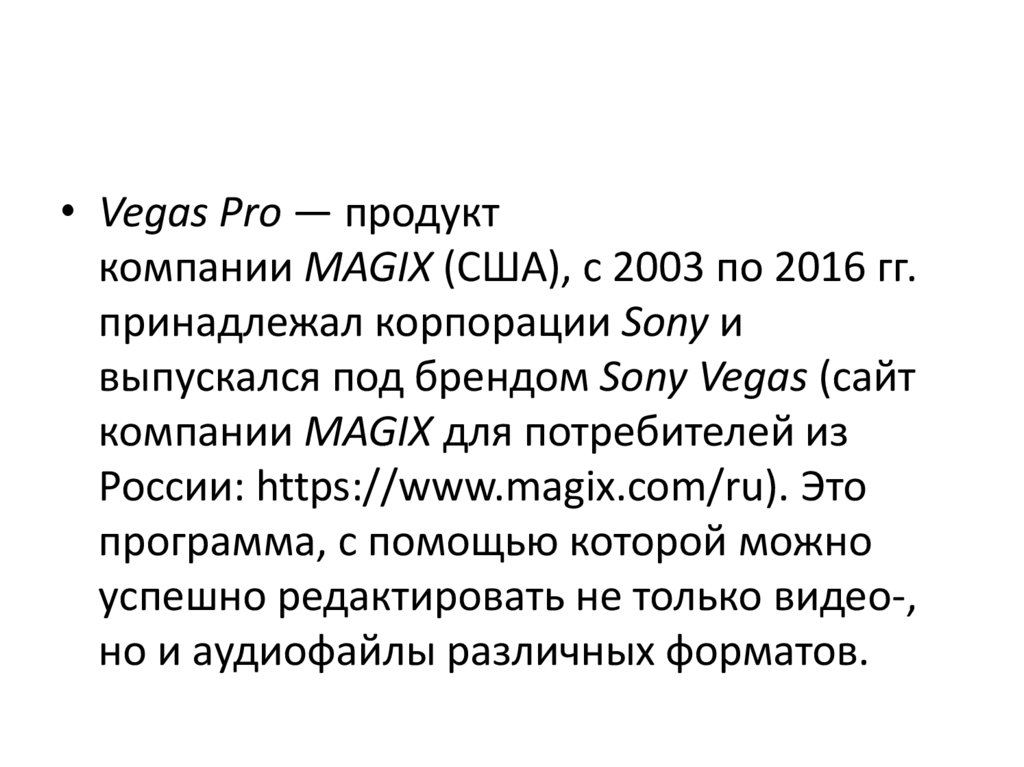 • Vegas Pro — продукткомпании MAGIX (США), с 2003 по 2016 гг.