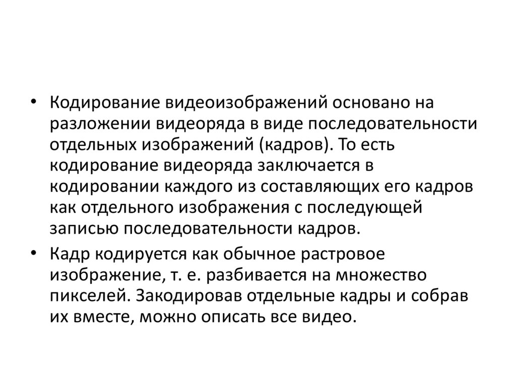 • Кодирование видеоизображений основано наразложении видеоряда в виде последовательности