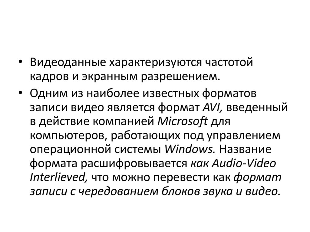• Видеоданные характеризуются частотойкадров и экранным разрешением.