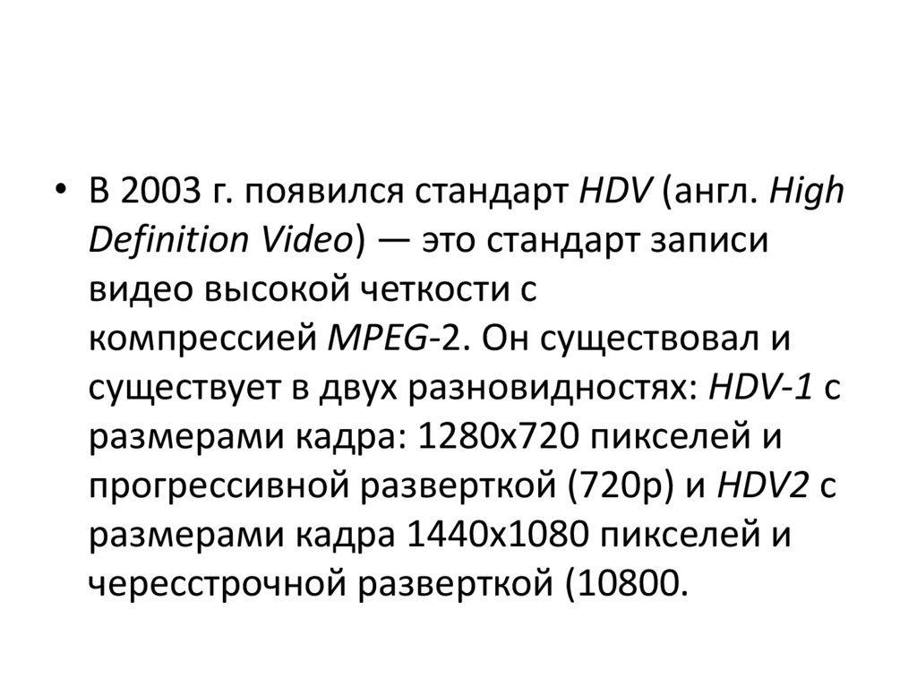 • В 2003 г. появился стандарт HDV (англ. HighDefinition Video) — это стандарт записи