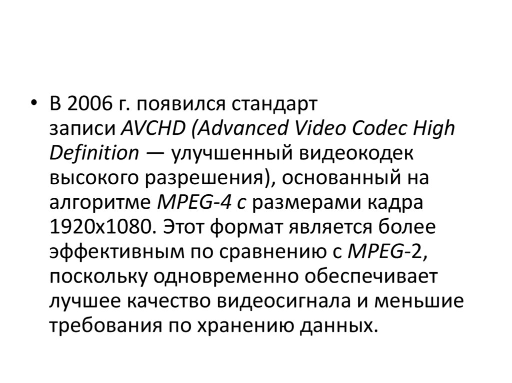 • В 2006 г. появился стандартзаписи AVCHD (Advanced Video Codec High
