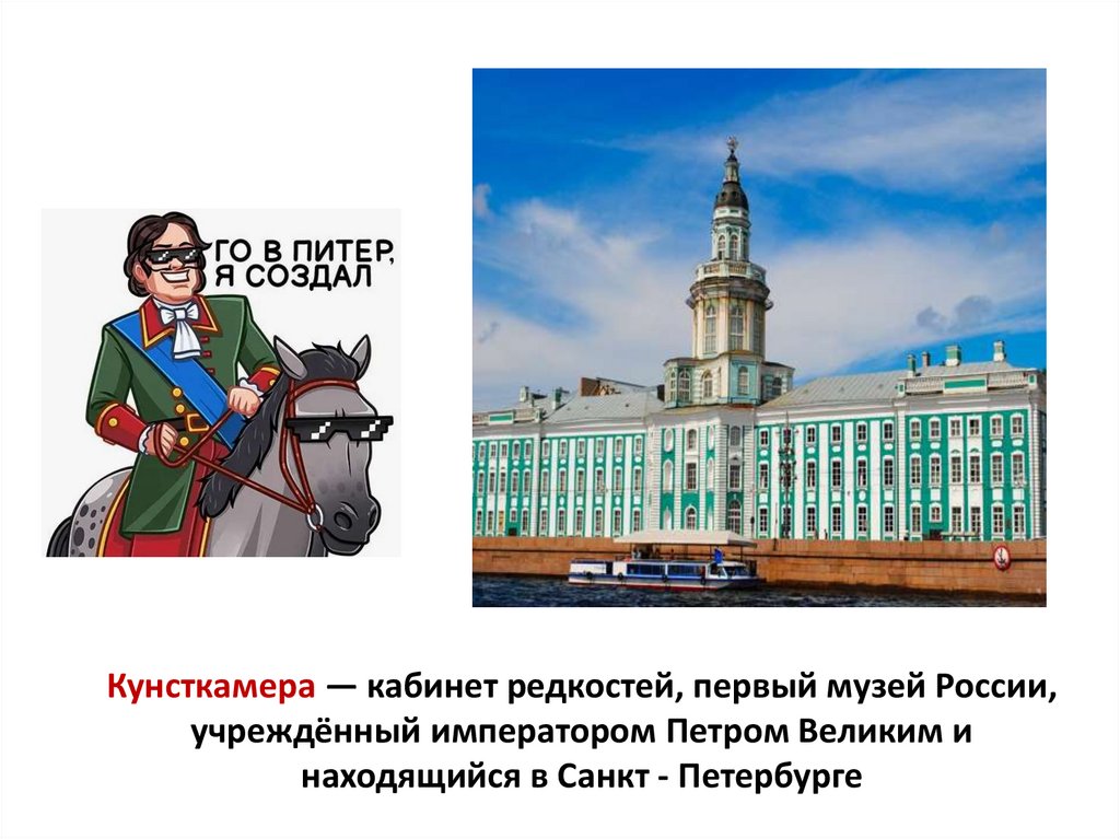 Кунсткамера — кабинет редкостей, первый музей России,учреждённый императором Петром Великим и