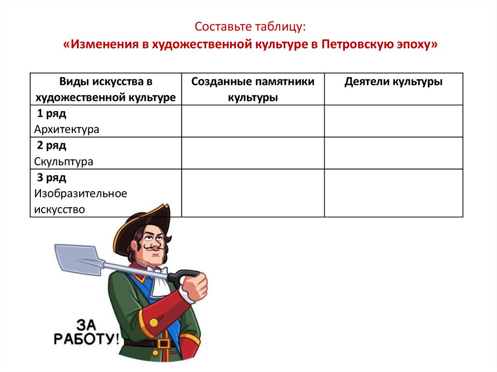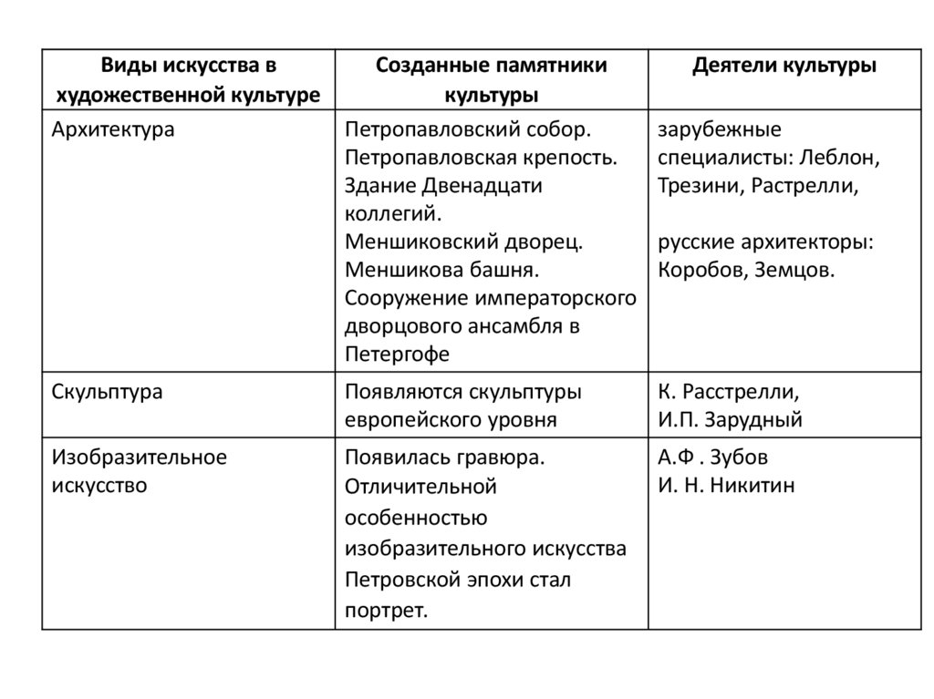 Составьте таблицу:«Изменения в художественной культуре в Петровскую эпоху»