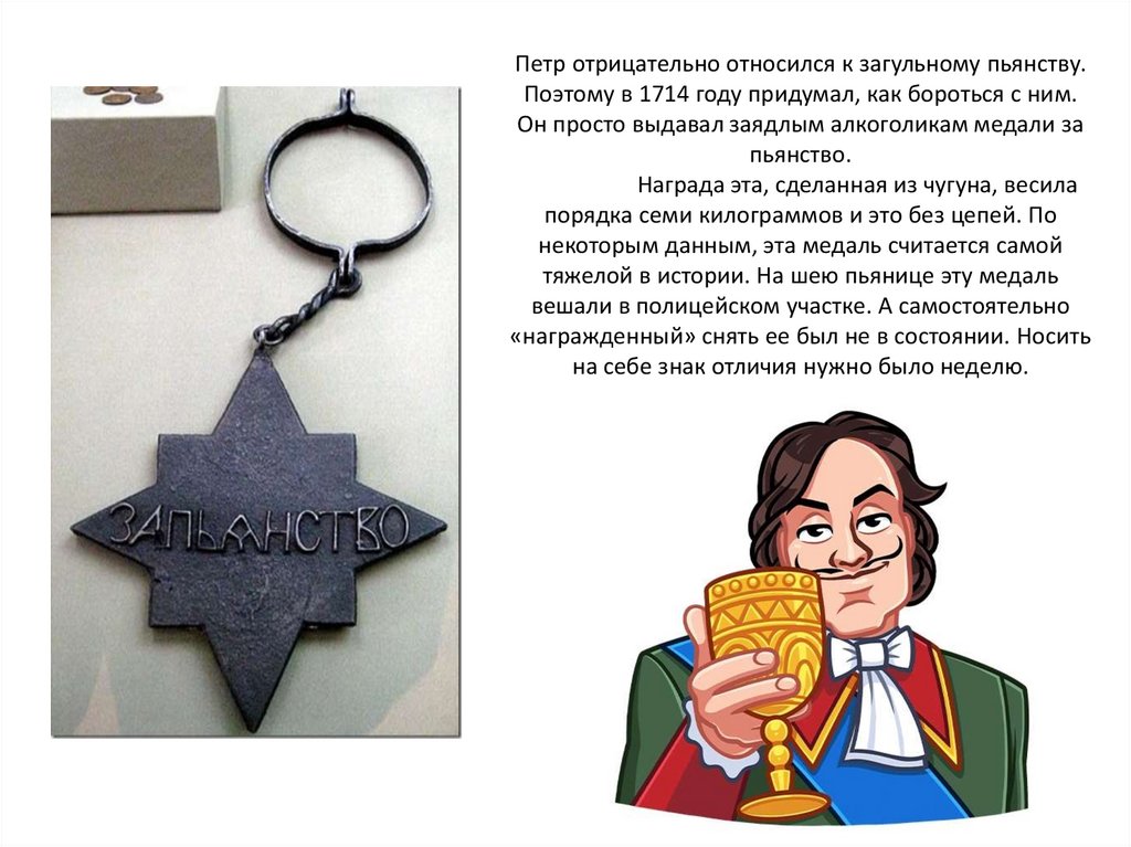 тяжелой в истории. На шею пьянице эту медаль