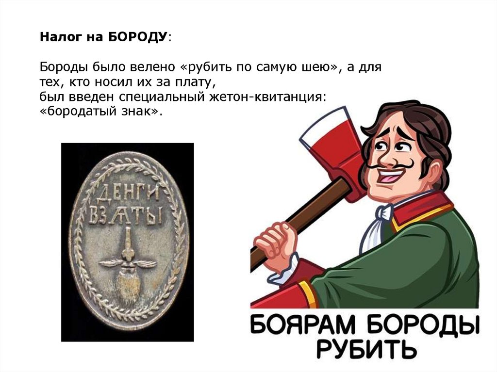 Налог на БОРОДУ:Бороды было велено «рубить по самую шею», а для