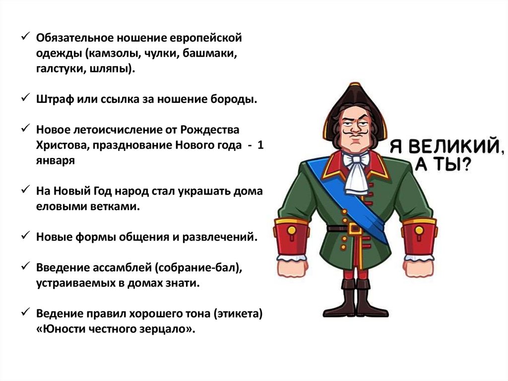 Обязательное ношение европейскойодежды (камзолы, чулки, башмаки,