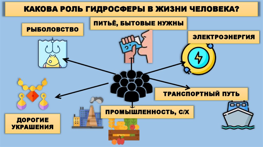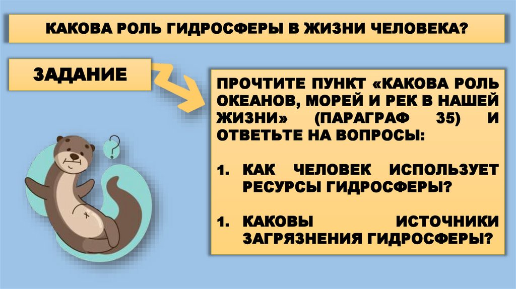 КАКОВА РОЛЬ ГИДРОСФЕРЫ В ЖИЗНИ ЧЕЛОВЕКА?ЗАДАНИЕ