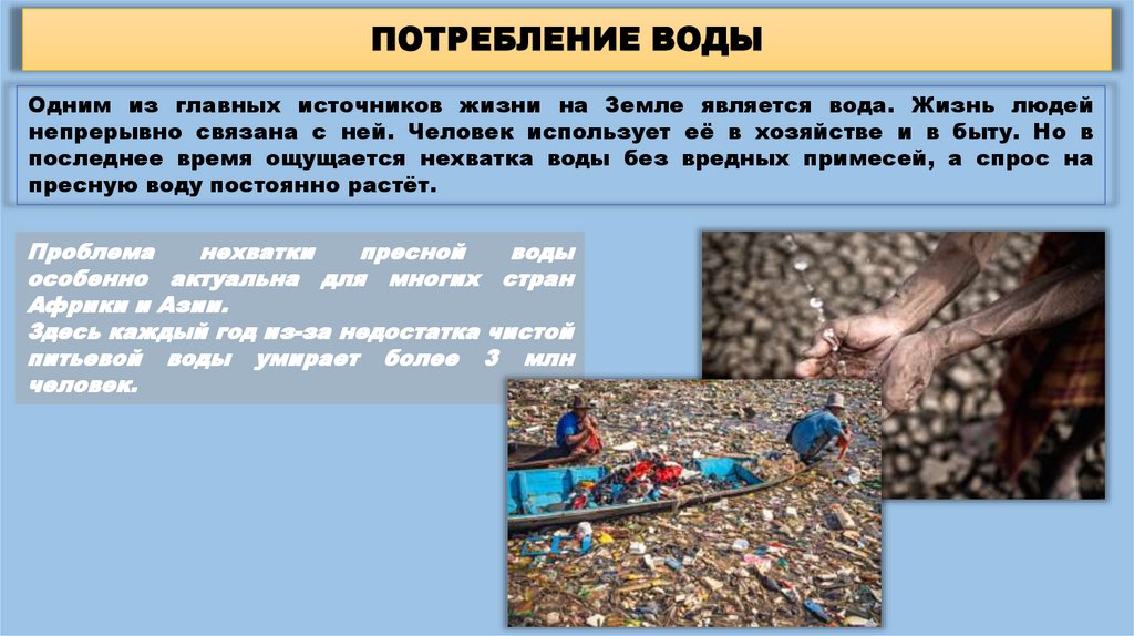 ПОТРЕБЛЕНИЕ ВОДЫОдним из главных источников жизни на Земле является вода. Жизнь людей