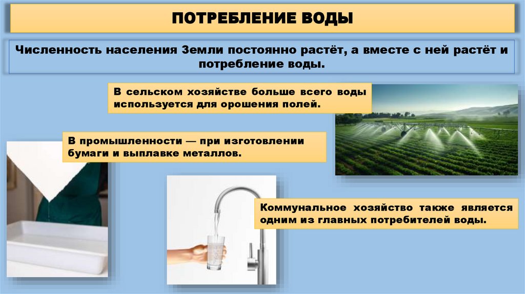 ПОТРЕБЛЕНИЕ ВОДЫЧисленность населения Земли постоянно растёт, а вместе с ней растёт и
